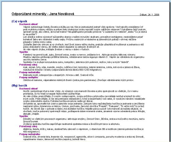 Program zobrazí zoznam odporúčaných minerálov, vyskytujúcich sa v odporúčaniach ku strave.