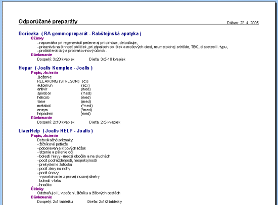 Program zobrazí odporúčané preparáty pre klienta, prípadne pre konkrétnu diagnózu, príznak, orgán,...