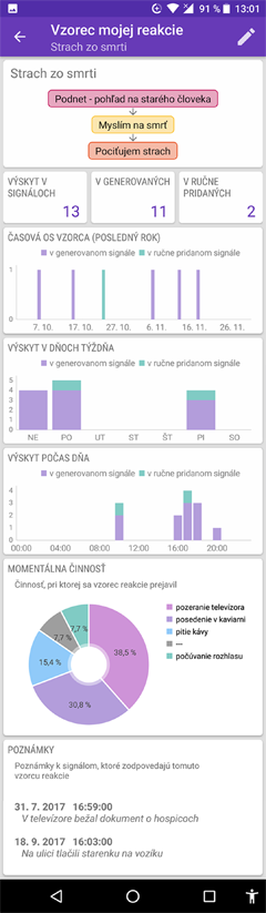ktoré je možné zaevidovať ako "Moje vzorce reakcií". Analýza vzorca reakcie ukáže kedy sa vzorec prejavil, v ktorých dňoch týždňa a v ktorých hodinách dňa sa najčastejšie opakoval a s akou činnosťou súvisí. Poznámky k signálom situáciu upresnia.