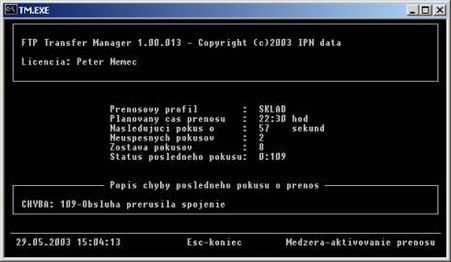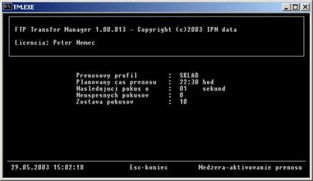 - plánovaný čas prenosu – čas, kedy program zrealizuje spojenie. Ak bol Transfer Manager spustený bez parametra –t, zobrazený čas bude 00:00 čo znamená, že sa prenos uskutoční okamžite