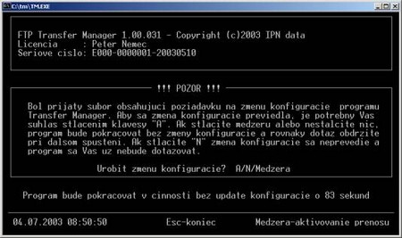 Program Transfer Manager je možné vzdialene rekonfigurovať. Zmena konfigurácie môže byť úplná, alebo sa len doplnia niektoré súbory a iné sa zmenia. Je možné meniť/dopĺňať nielen základné konfiguračné súbory, ale aj pomocné BAT súbory, nachádzajúce sa v adresári Transfer Managera.